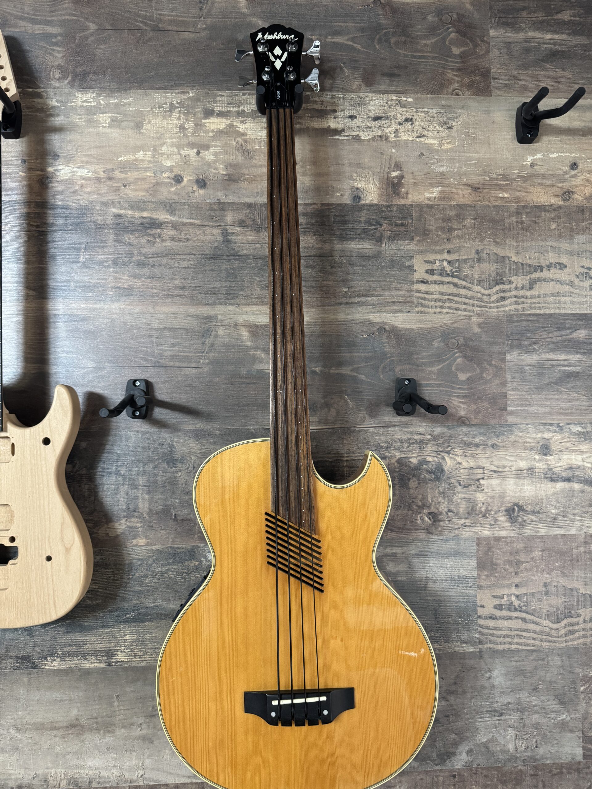 El Washburn AB20 Fretless es una verdadera «rara avis» y un icono de los años 90. Es famoso no solo por su estética elegante, sino por resolver uno de los mayores problemas de los bajos acústicos: el acople (feedback).