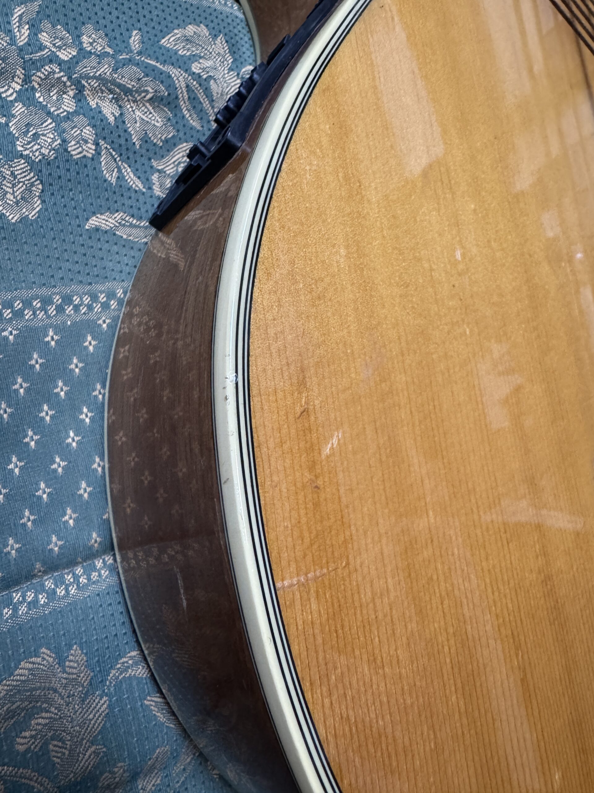Cuerpo: tapa de abeto y aros/fondo de arce laminado. Es un cuerpo tipo jumbo pero más delgado de lo habitual, lo que lo hace muy cómodo de colgar.