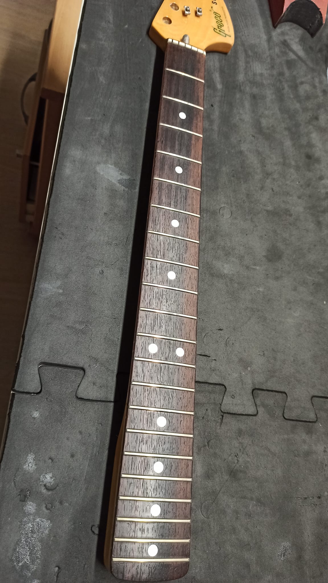 Todo tiene un desgaste y más después de un buen uso y esta guitarra Greco de los 80’s necesitaba un cambio de trastes.